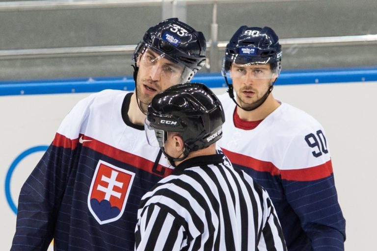 Zľava: Hráči Slovenska Michal Handzuš a Marián Hossa počas zápasu Česko - Slovensko o postup do štvrťfinále na ZOH 2014 v Soči. Rusko, Soči, 18. február 2014. Foto: SITA/Jozef Jakubčo