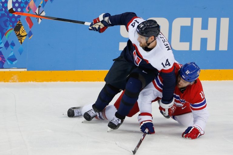 Slovenský obranca Andrej Meszároš v súboji s českým útočníkom Martinom Hanzalom počas utorňajšieho zápasu o postup do štvrťfinále olympijského turnaja v Soči. Foto: SITA/AP