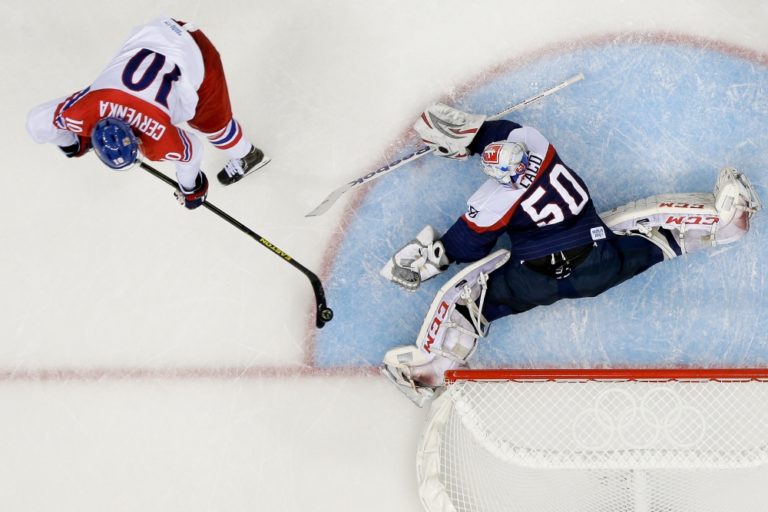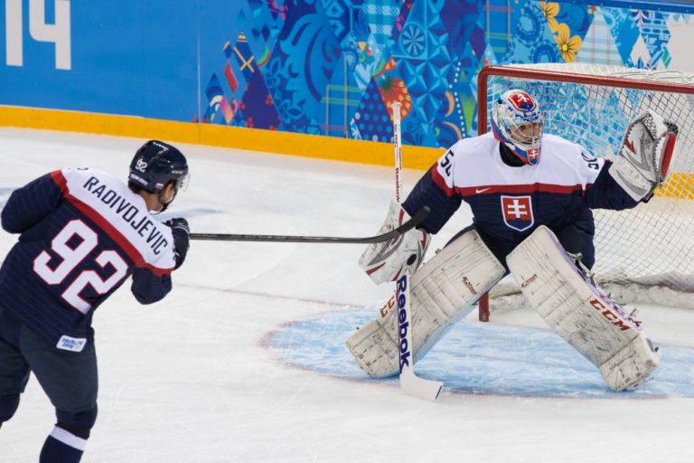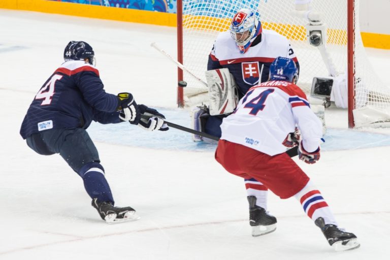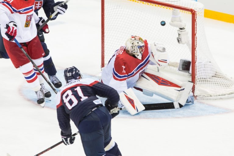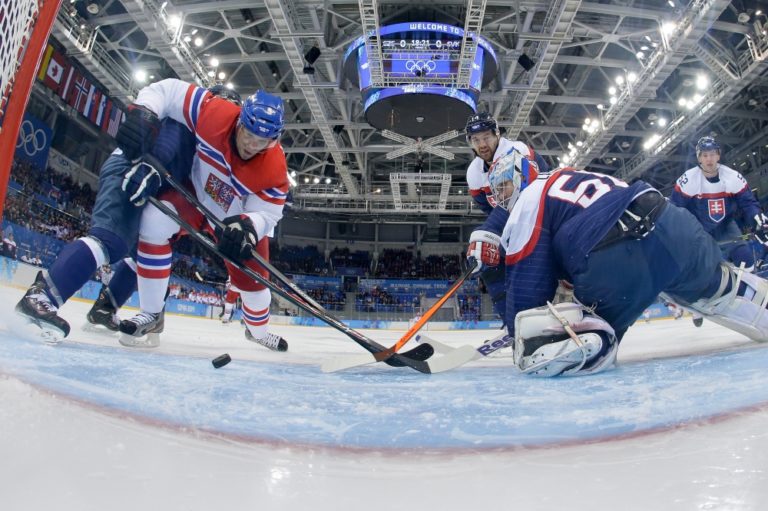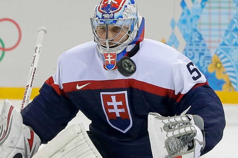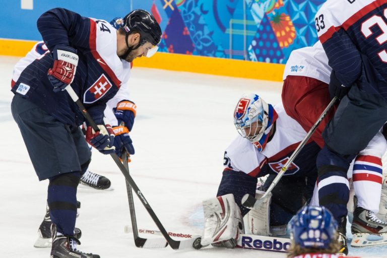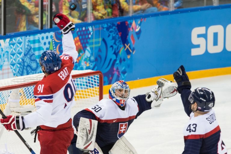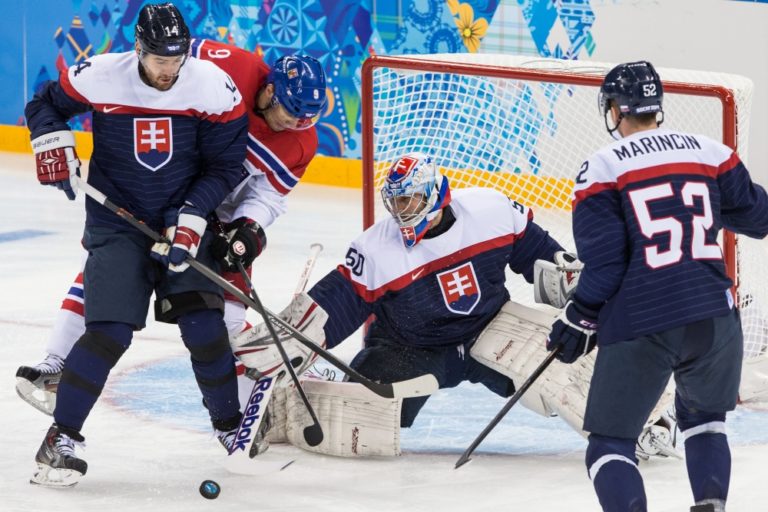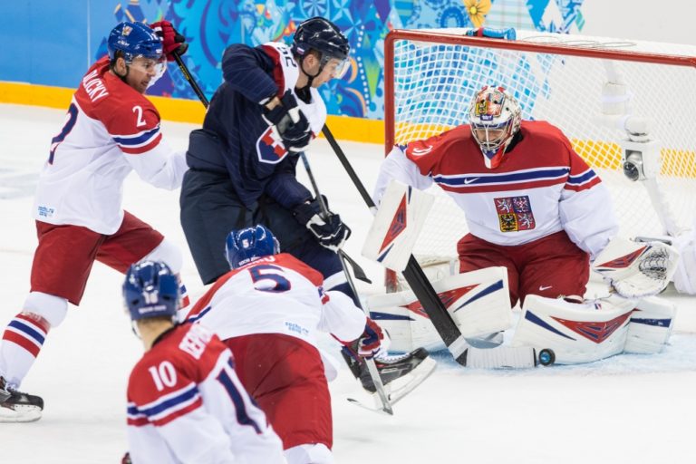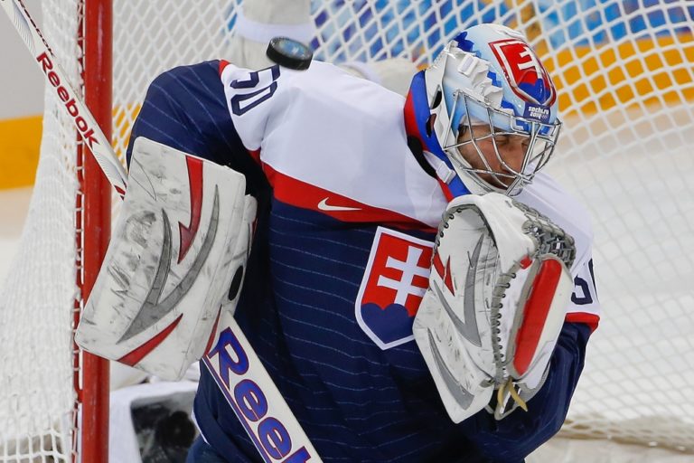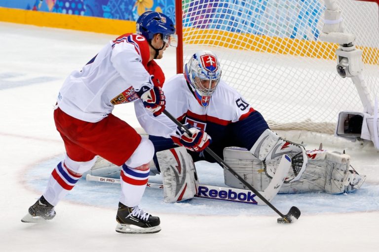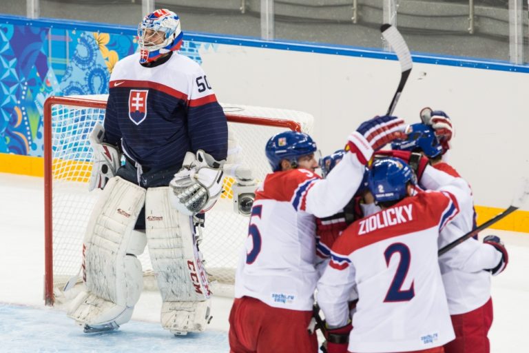 Brankár Slovenska Ján Laco (vľavo) počas hokejového zápasu Česko - Slovensko o postup do štvrťfinále na ZOH 2014 v Soči. Rusko, Soči, 18. február 2014. Foto: SITA/Jozef Jakubčo
