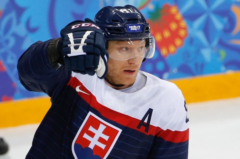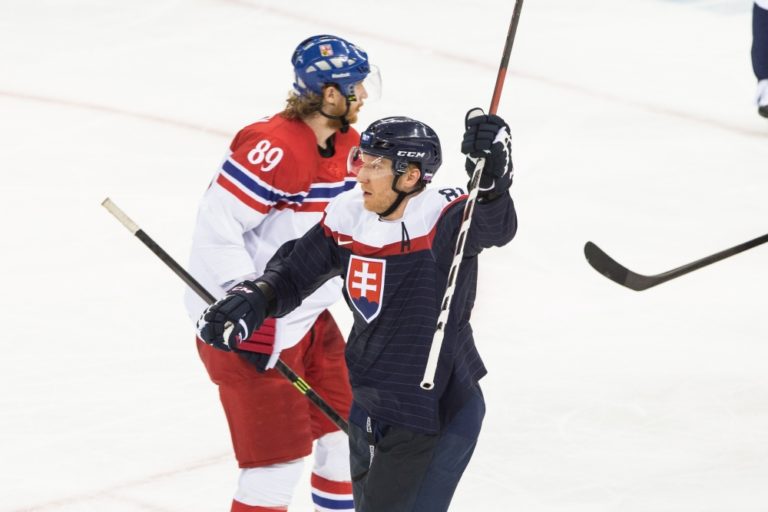 Hráč Slovenska Marián Hossa (vpravo) počas zápasu Česko - Slovensko o postup do štvrťfinále na ZOH 2014 v Soči. Rusko, Soči, 18. február 2014. Foto: SITA/Jozef Jakubčo