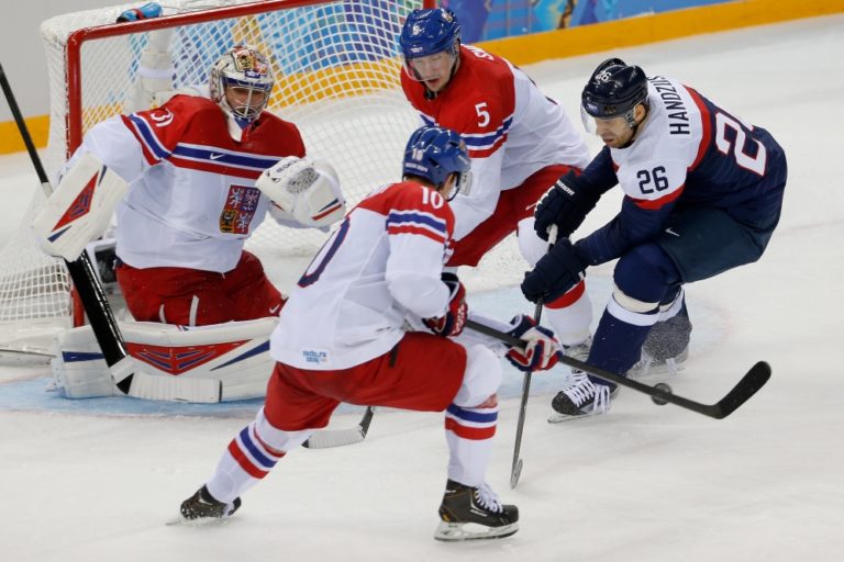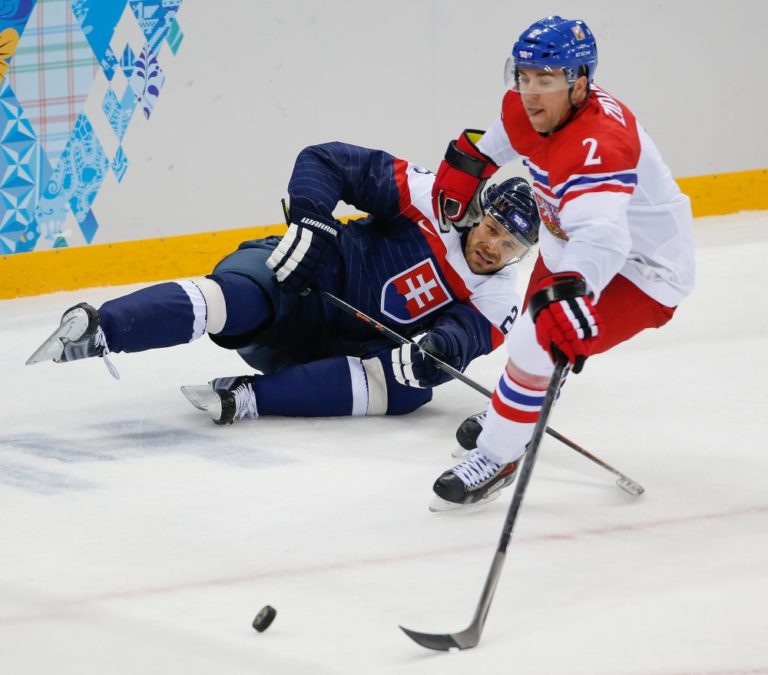 Český hokejista Marek Zidlicky s Michalom Handzušom v boji o štvrtfinále v Soči. Foto: SITA/AP
