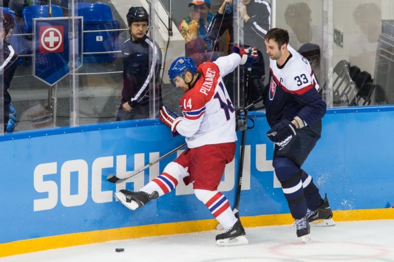 Sprava: Hráč Slovenska Zdeno Chára a hráč Česka Tomáš Plekanec počas zápasu Česko - Slovensko o postup do štvrťfinále na ZOH 2014 v Soči. Rusko, Soči, 18. február 2014. Foto: SITA/Jozef Jakubčo