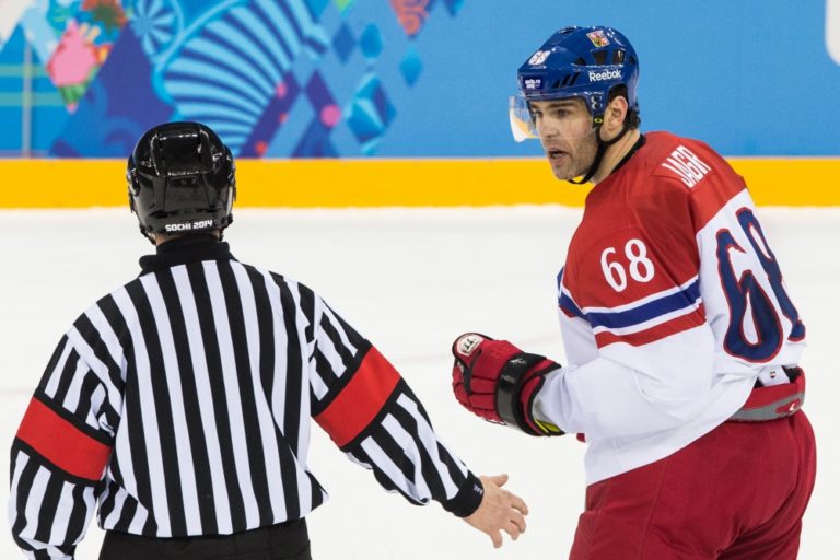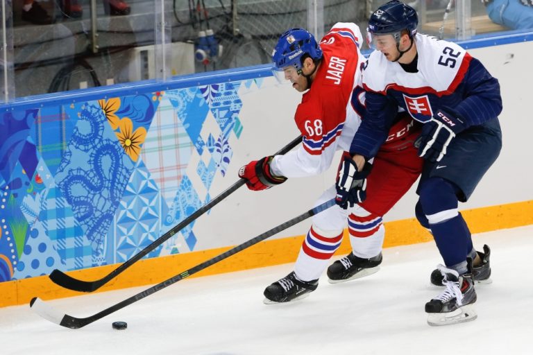 Hráč Česka Jaromír Jágr (vľavo) počas zápasu Česko - Slovensko o postup do štvrťfinále na ZOH 2014 v Soči. Rusko, Soči, 18. február 2014. Foto: SITA/Jozef Jakubčo