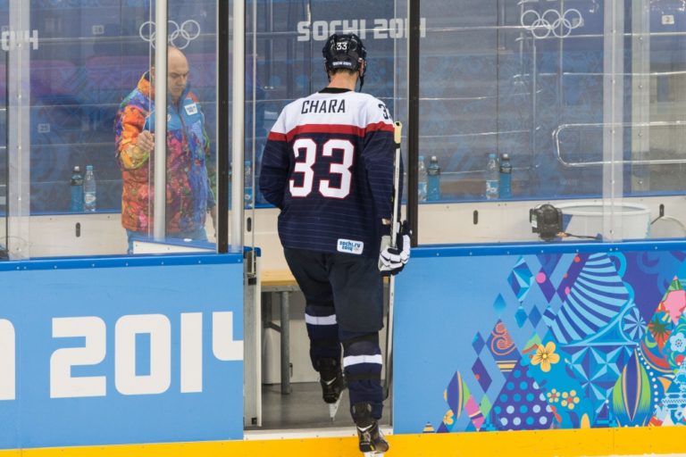 Hráč Slovenska Zdeno Chára počas zápasu Česko - Slovensko o postup do štvrťfinále na ZOH 2014 v Soči. Rusko, Soči, 18. február 2014. Foto: SITA/Jozef Jakubčo