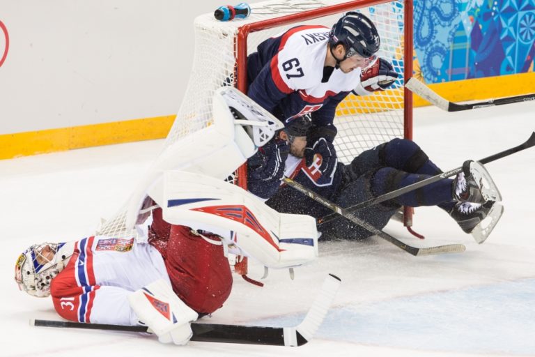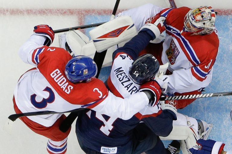 Zľava: Brankár Česka Ondřej Pavelec a hráči Slovenska Tomáš Záborský a Andrej Meszároš počas zápasu Česko - Slovensko o postup do štvrťfinále na ZOH 2014 v Soči. Rusko, Soči, 18. február 2014. Foto: SITA/AP