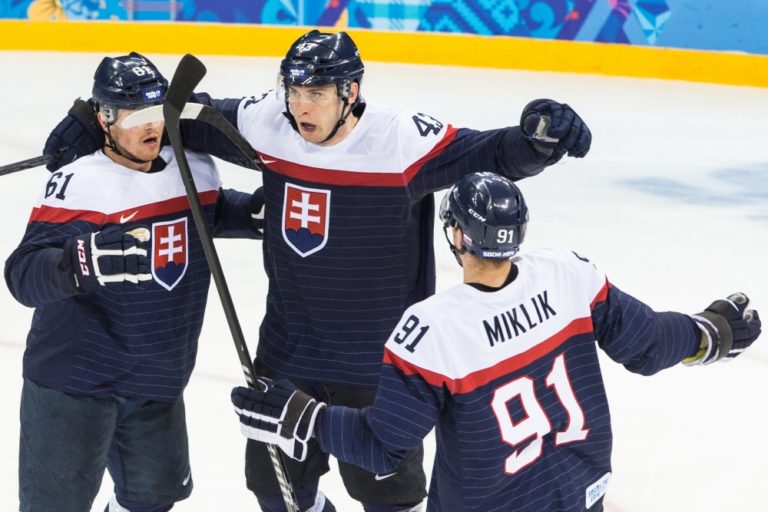 Sprava: Hráči Slovenska Michel Miklík, Tomáš Surový a Milan Bartovič počas zápasu Česko - Slovensko o postup do štvrťfinále na ZOH 2014 v Soči. Rusko, Soči, 18. február 2014. Foto: SITA/Jozef Jakubčo