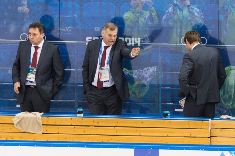 Asistent trénera Slovenska Peter Oremus, tréner Slovenska Vladimír Vůjtek počas zápasu Česko - Slovensko o postup do štvrťfinále na ZOH 2014 v Soči. Foto: SITA/Jozef Jakubčo