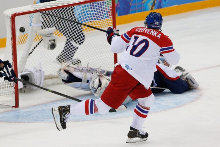 Český útočník Roman Červenka strieľa druhý gól svojho tímu v zápase o postup do štvrťfinále olympijského turnaja proti Slovensku. Foto: SITA/AP