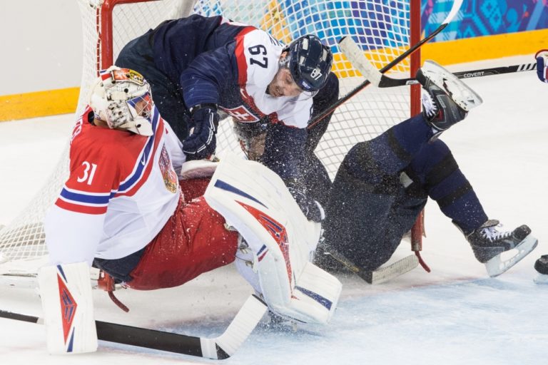 Sprava: Brankár Česka Ondřej Pavelec a hráč Slovenska Marián Hossa počas zápasu Česko - Slovensko o postup do štvrťfinále na ZOH 2014 v Soči. Rusko, Soči, 18. február 2014. Foto: SITA/Jozef Jakubčo