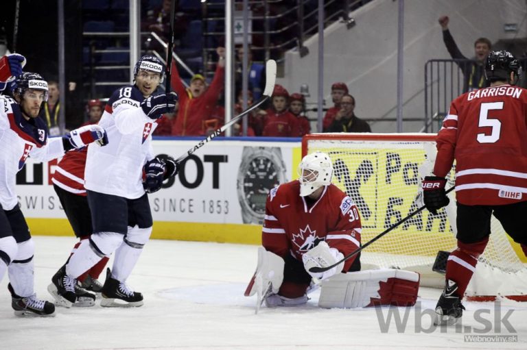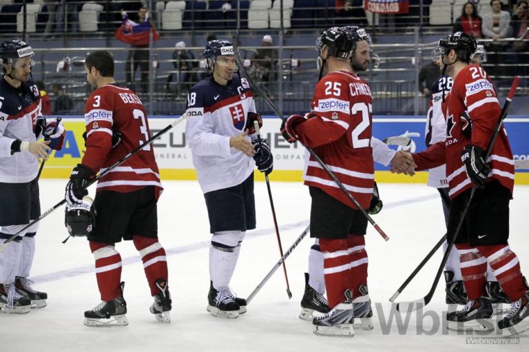 Radosť kanadských hokejistov po góle v sieti Slovenska počas sobotňajšieho zápasu na MS v hokeji. Foto: SITA/AP
