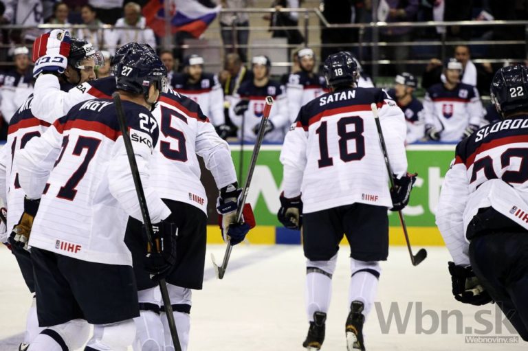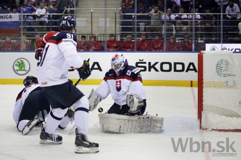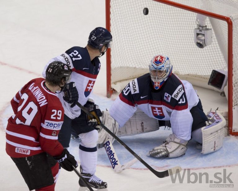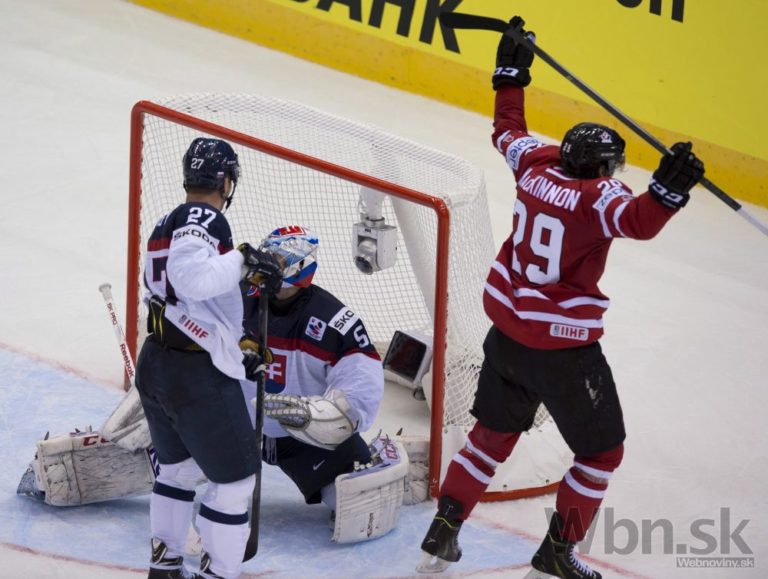 Útočníci Nathan MacKinnon a Ladislav Nagy sa pozerajú ako končí puk v sieti Ján Laca počas sobotňajšieho zápasu na MS v hokeji. Foto: SITA/AP