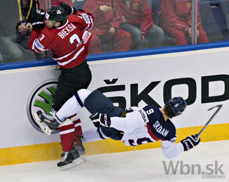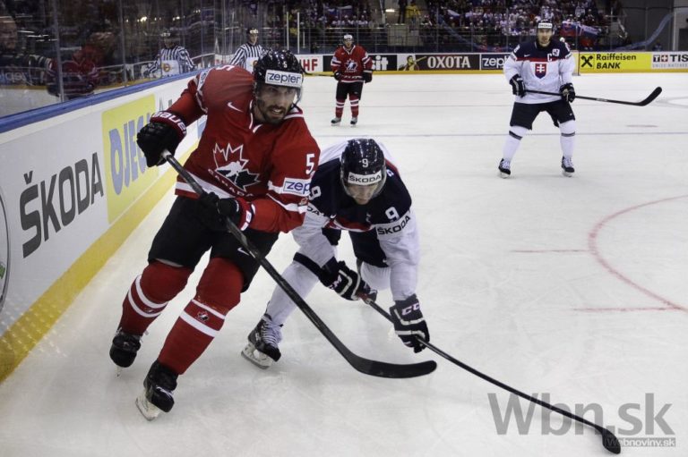 Slovenský útočník Dávid Skokan v súboji s Kanaďanom Kevinom Bieksom počas sobotňajšieho zápasu na MS v hokeji. Foto: SITA/AP