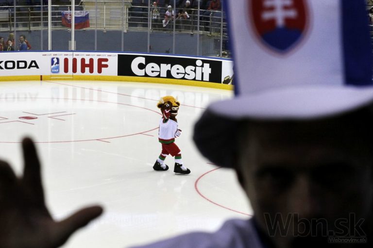 Maskot Volat povzbudzuje slovenských fanúšikov počas zápasu Kanada - Slovensko základnej skupiny majstrovstiev sveta v ľadovom hokeji 2014 v Minsku. Bielorusko, Minsk, 10. máj 2014. Foto: SITA/Ján Viazanička