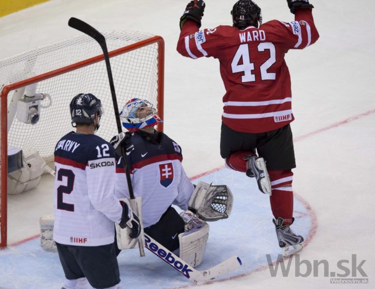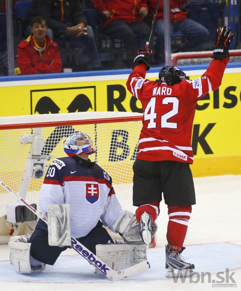 Kanaďan Joel Ward sa raduje z gólu v sieti slovenského brankára Jána Laca počas sobotňajšieho zápasu na MS v hokeji. Foto: SITA/AP