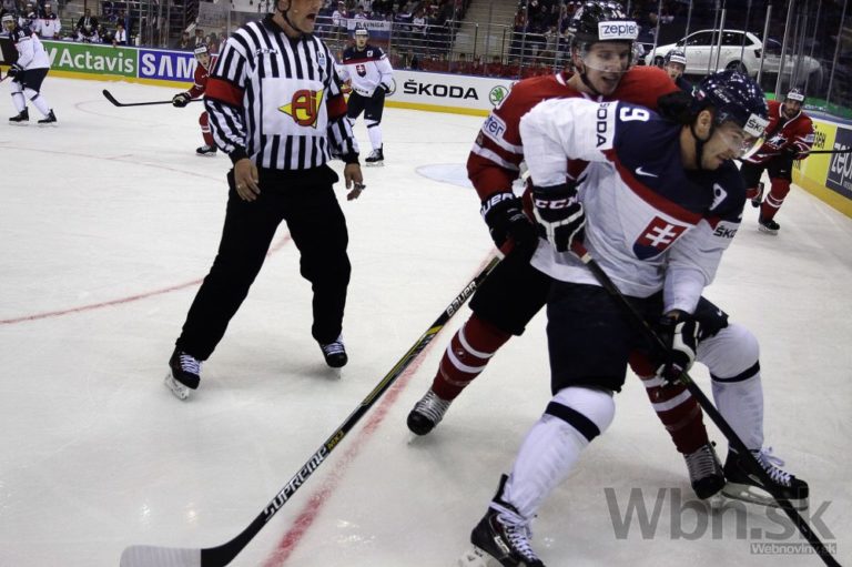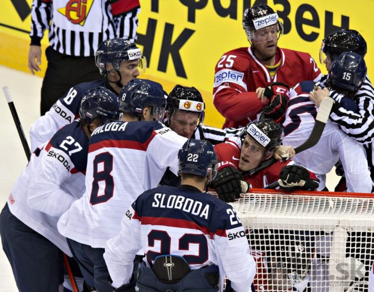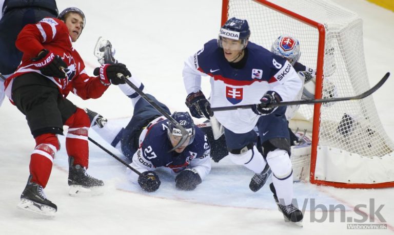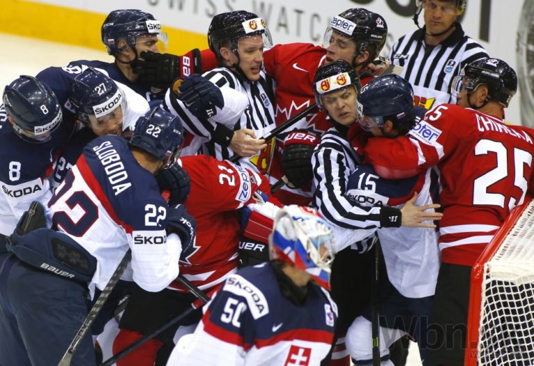 Naťahovačky medzi slovenskými a kanadskými hokejistami počas sobotňajšieho zápasu na svetovom šampionáte. Foto: SITA/AP