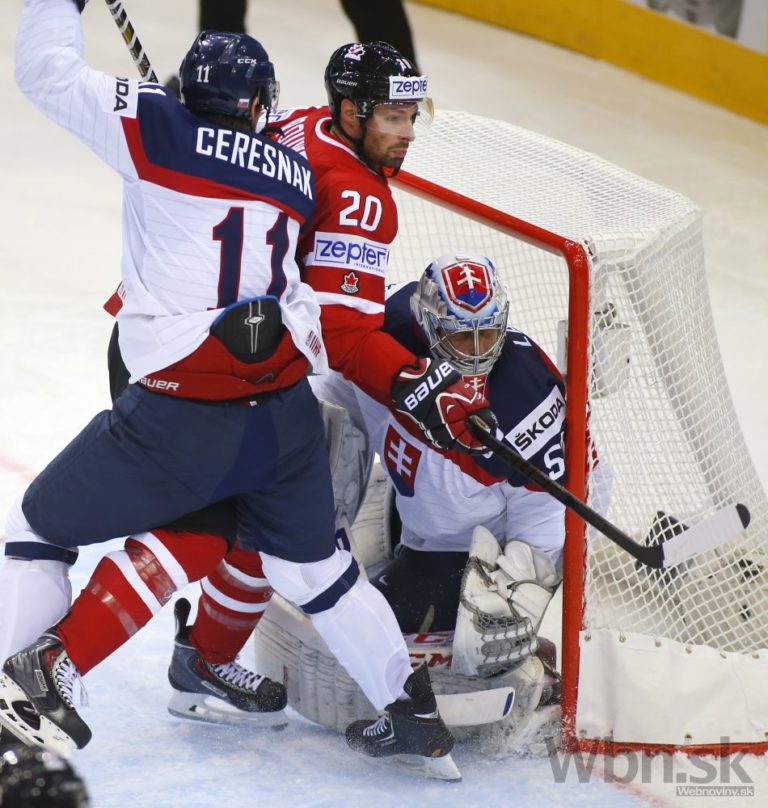 Kanaďan Troy Brouwer v súboji so slovenským obrancom Petrom Čerešňákom pred brankárom Jánom Lacom počas sobotňajšieho zápasu na MS v hokeji. Foto: SITA/AP