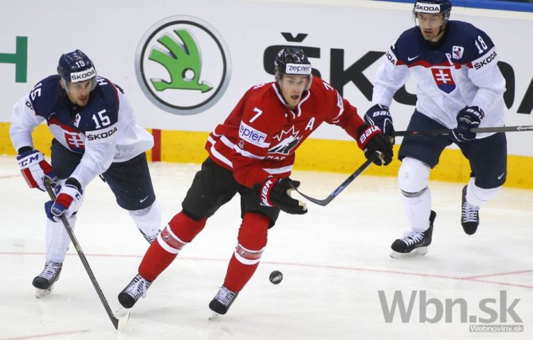 Kanaďan Kyle Turris v súboji so slovenským útočníkom Ladislavom Nagyom pred brankárom Jánom Lacom počas sobotňajšieho zápasu na MS v hokeji. Foto: SITA/AP