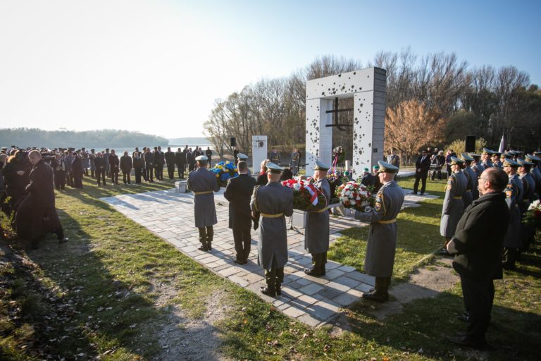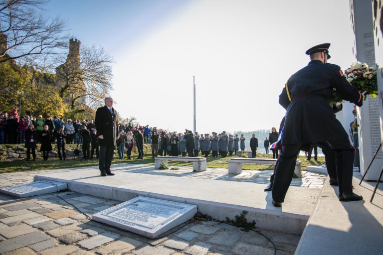 Prezident SR Andrej Kiska (vľavo) počas pietnej spomienky na obete komunizmu pred pamätníkom Brána slobody na Devíne pri príležitosti Dňa boja za slobodu a demokraciu. Bratislava, 17. november 2018. Foto: SITA/Jana Birošová