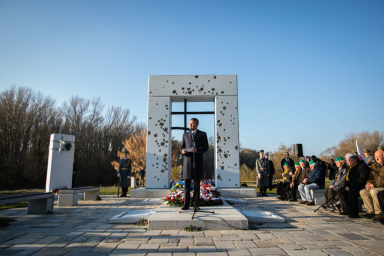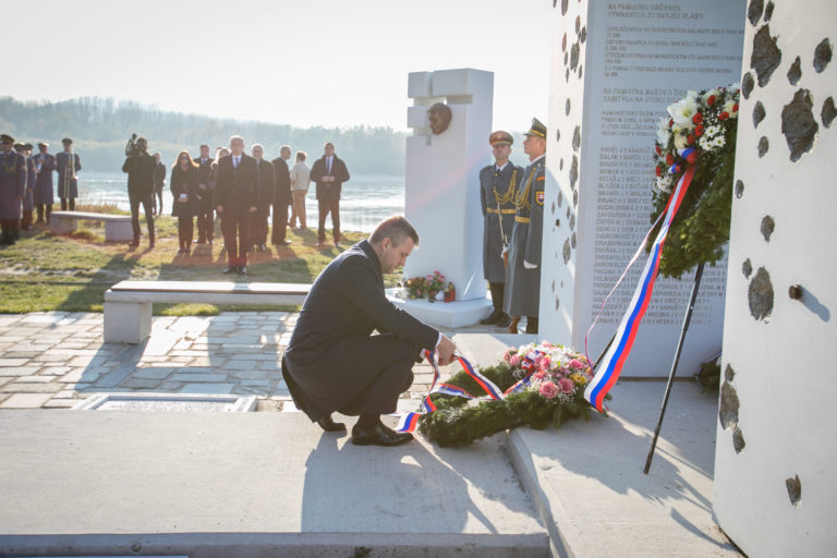 Predseda vlády SR Peter Pellegrini (v strede) počas pietnej spomienky na obete komunizmu pred pamätníkom Brána slobody na Devíne pri príležitosti Dňa boja za slobodu a demokraciu. Bratislava, 17. november 2018. Foto: SITA/Jana Birošová