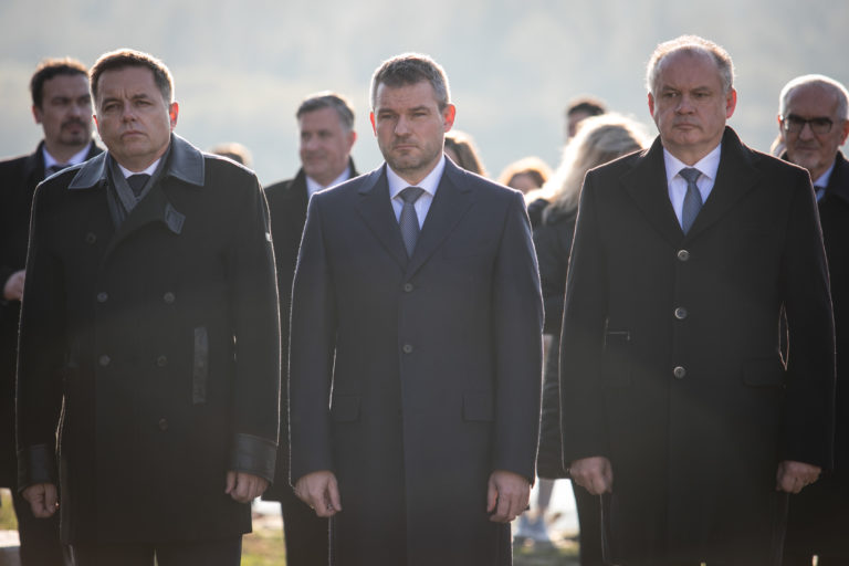 Zľava: Minister financií SR Peter Kažimír, predseda vlády SR Peter Pellegrini a prezident SR Andrej Kiska počas pietnej spomienky na obete komunizmu pred pamätníkom Brána slobody na Devíne pri príležitosti Dňa boja za slobodu a demokraciu. Bratislava, 17. november 2018. Foto: SITA/Jana Birošová