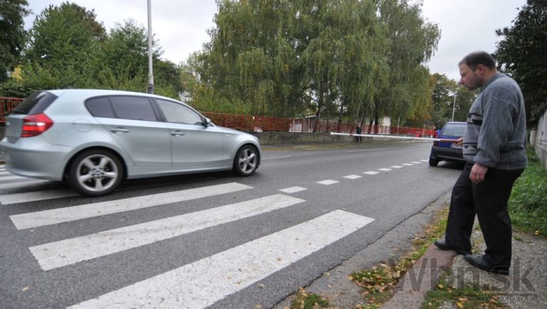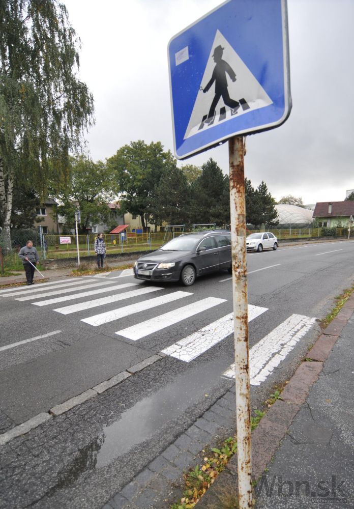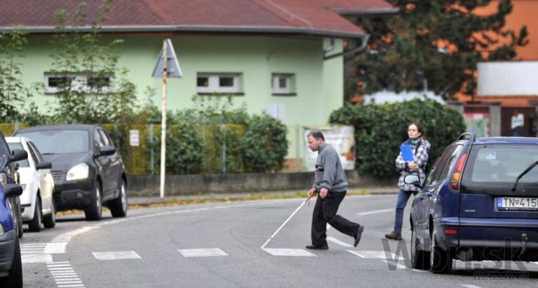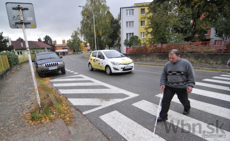Nevidiaci kráča cez prechod počas 6. ročníka dopravno-výchovnej akcie pri príležitosti Svetového dňa bielej palice, ktorú organizuje Únia nevidiacich a slabozrakých Slovenska v spolupráci s Prezídiom Policajného zboru v 51 mestách na Slovensku. Trenčín, 15. október 2015. Foto: SITA/Tomáš Somr