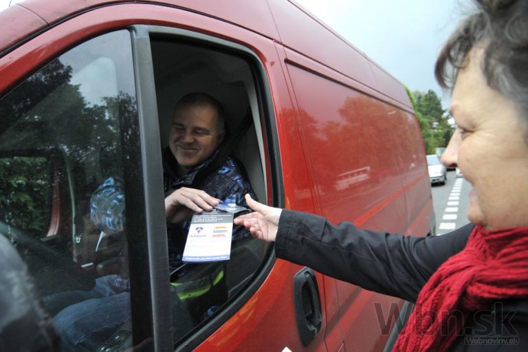 Vodič dostáva upomienkové predmety počas 6. ročníka dopravno-výchovnej akcie pri príležitosti Svetového dňa bielej palice, ktorú organizuje Únia nevidiacich a slabozrakých Slovenska v spolupráci s Prezídiom Policajného zboru v 51 mestách na Slovensku. Trenčín, 15. október 2015. Foto: SITA/Tomáš Somr
