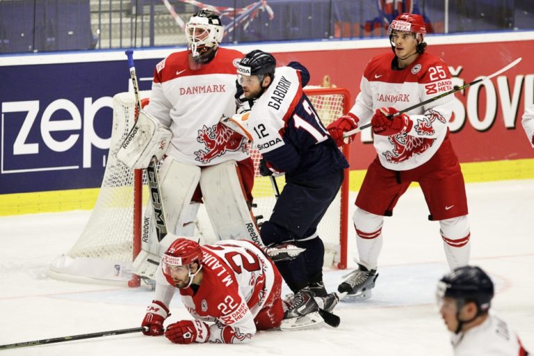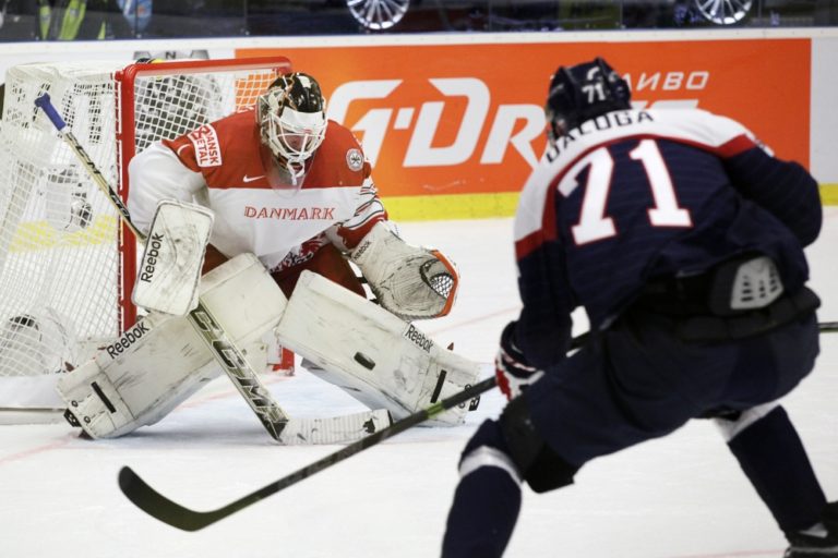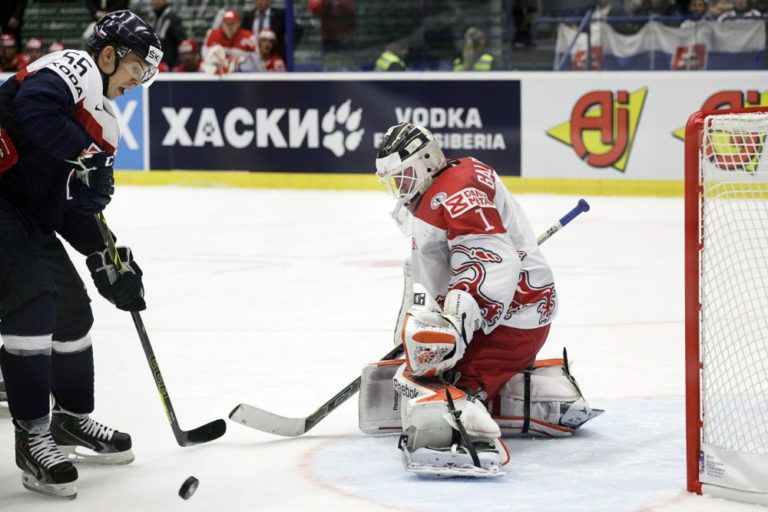 Dánsky gólman Patrick Galbraith vyráža puk po zakončení slovenského útočníka Marka Viedenského počas zápasu základnej B-skupiny majstrovstiev sveta v ľadovom hokeji 2015 v Českej republike. Ostrava, 2. máj 2015. Foto: SITA/Ján Viazanička