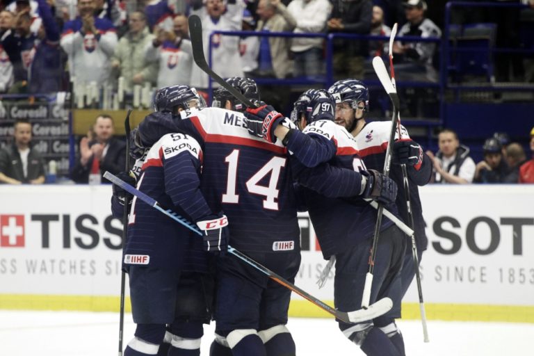 Slovenskí hokejisti po zápase základnej B-skupiny majstrovstiev sveta v ľadovom hokeji 2015, v ktorom zdolali Dánsko 4:3 po samostatných nájazdoch. Ostrava, 2. máj 2015. Foto: SITA/Ján Viazanička