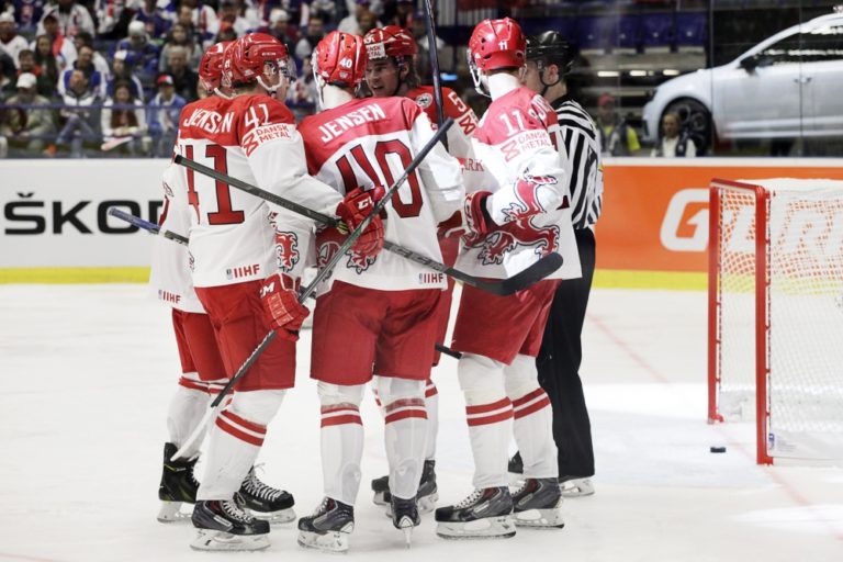Radosť dánskych hokejistov po góle v sieti Slovenska počas zápasu základnej B-skupiny majstrovstiev sveta v ľadovom hokeji 2015 v Českej republike. Ostrava, 2. máj 2015. Foto: SITA/Ján Viazanička