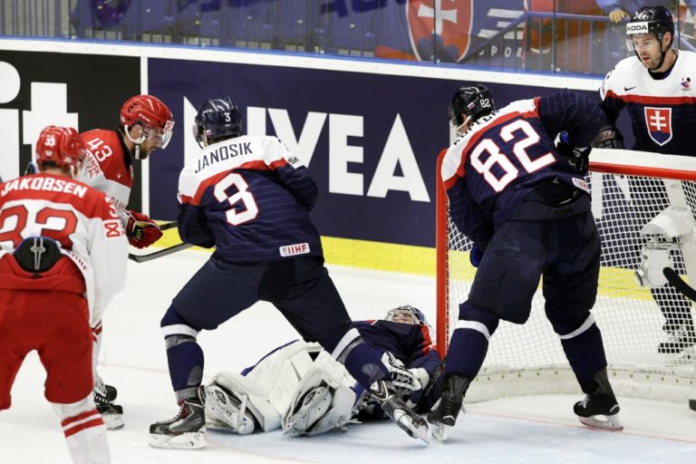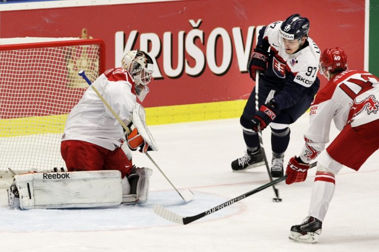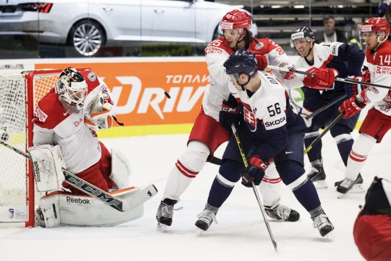 Slovenský obranca Marek Ďaloga sa snaží prekonať dánskeho brankára Patricka Galbraitha počas zápasu základnej B-skupiny majstrovstiev sveta v ľadovom hokeji 2015 v Českej republike. Ostrava, 2. máj 2015. Foto: SITA/Ján Viazanička