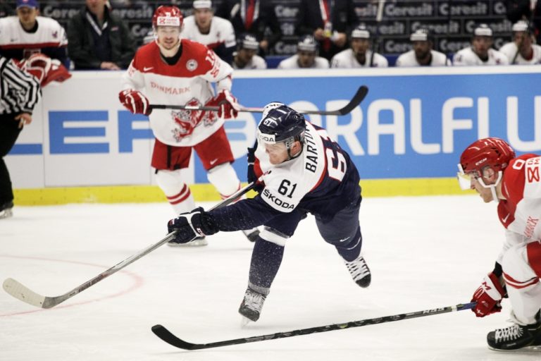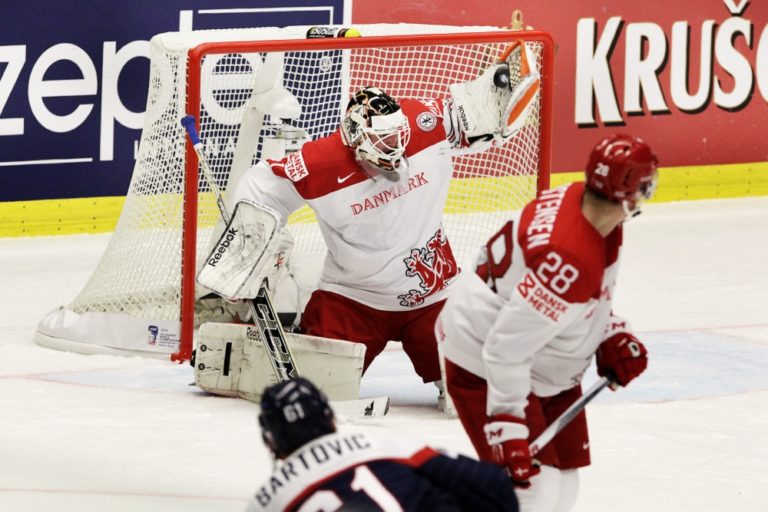 Dánsky gólman Patrick Galbrait vyráža puk po strele slovenského útočníka Milana Bartoviča počas zápasu základnej B-skupiny majstrovstiev sveta v ľadovom hokeji 2015 v Českej republike. Ostrava, 2. máj 2015. Foto: SITA/Ján Viazanička