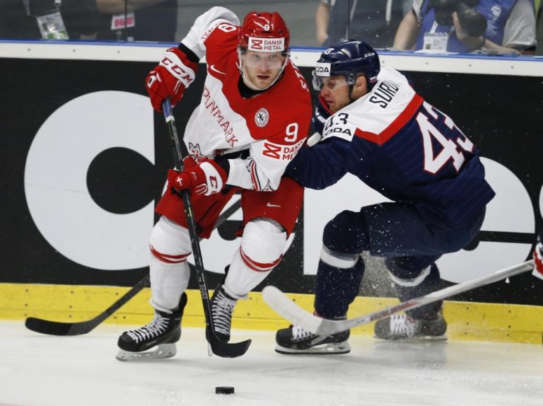 Slovenský útočník Tomáš Surový v súboji s Dánom Frederikom Stormom počas zápasu základnej B-skupiny majstrovstiev sveta v ľadovom hokeji 2015 v Českej republike. Ostrava, 2. máj 2015. Foto: SITA/AP
