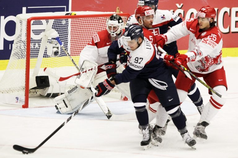 Slovenský útočník Patrik Lušňák sa snaží prekonať dánskeho brankára Patricka Galbraitha počas zápasu základnej B-skupiny majstrovstiev sveta v ľadovom hokeji 2015 v Českej republike. Ostrava, 2. máj 2015. Foto: SITA/Ján Viazanička