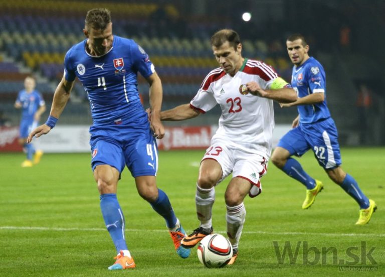 Slovenský futbalista Róbert Mak v súboji s Bielorusom Maksim Bordačevom počas kvalifikačného zápasu o postup na ME 2016 do Francúzska. Borisov, 12. október 2014. Foto: SITA/AP