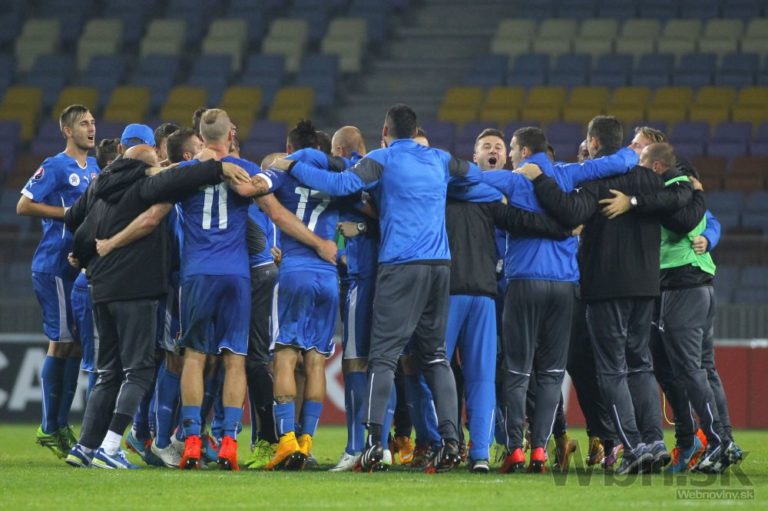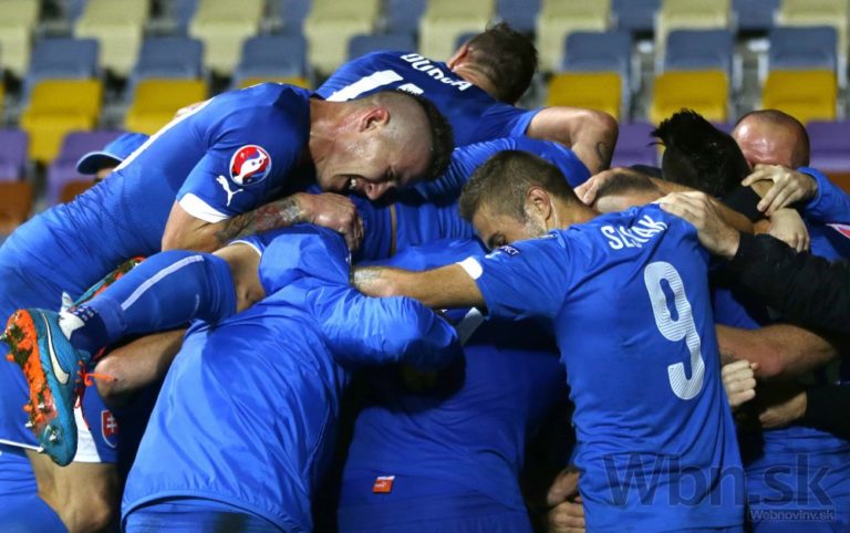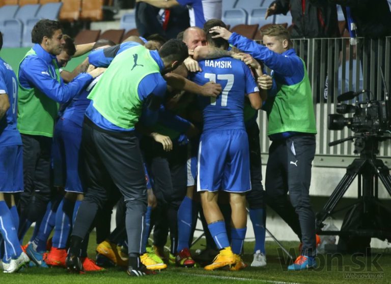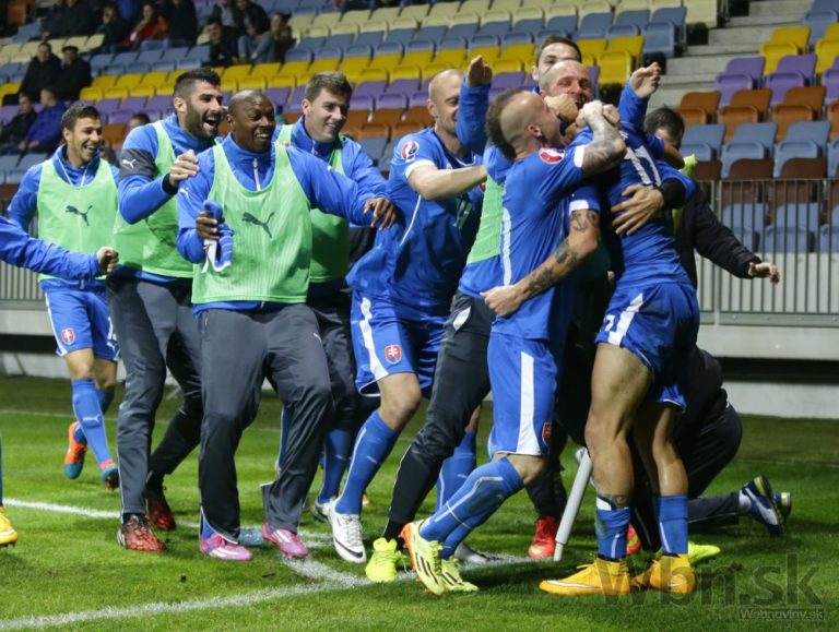 Slovenskí futbalisti sa radujú z víťazstva nad Bieloruskom 3:1 v kvalifikačnom zápase o postup na ME 2016 do Francúzska. Borisov, 12. október 2014. Foto: SITA/AP