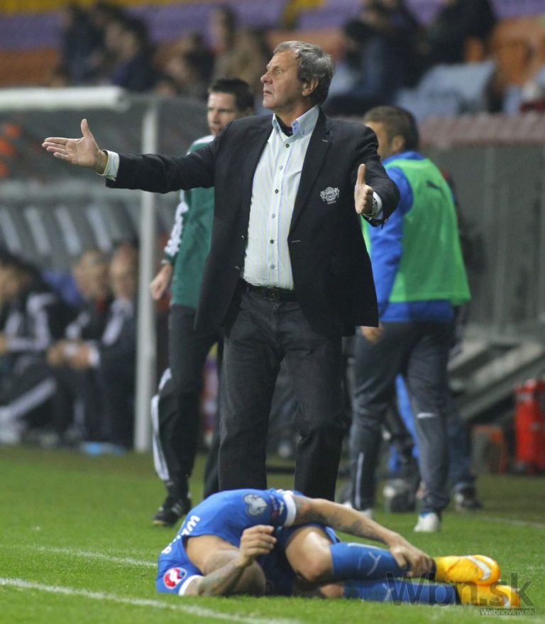 Tréner slovenskej futbalovej reprezentácie Ján Kozák gestikuluje s hlavným rozhodcom po faule na Vladimíra Weissa počas kvalifikačného zápasu o postup na ME 2016 do Francúzska. Borisov, 12. október 2014. Foto: SITA/AP