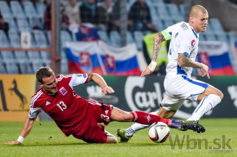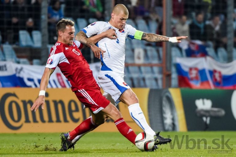 Kapitán slovenskej futbalovej reprezentácie Martin Škrtel v súboji s Luxemburčanom Aurelienom Joachimom počas kvalifikačného zápasu o postup na ME 2016 do Francúzska. Luxemburg, 12. október 2015. Foto: SITA/AP