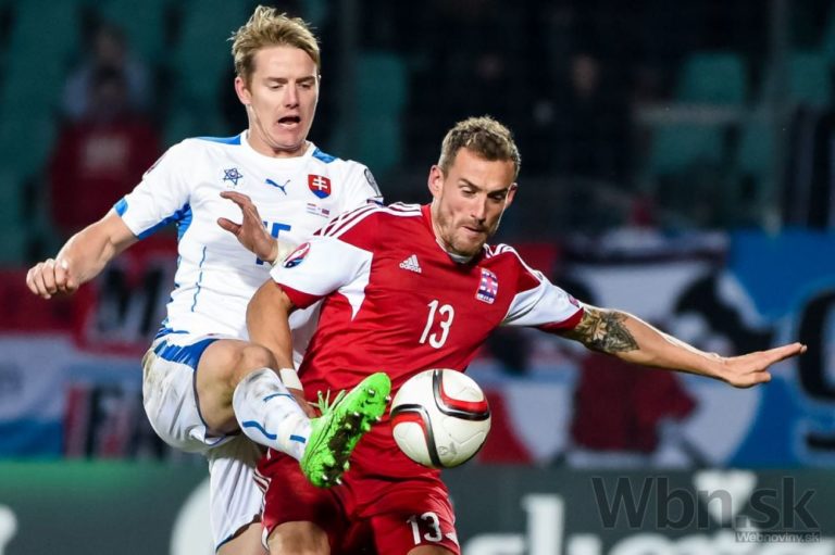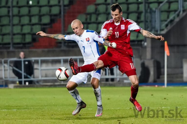 Slovenský futbalista Vladimír Weiss v súboji s Luxemburčanom Stefanom Bensim počas kvalifikačného zápasu o postup na ME 2016 do Francúzska. Luxemburg, 12. október 2015. Foto: SITA/AP