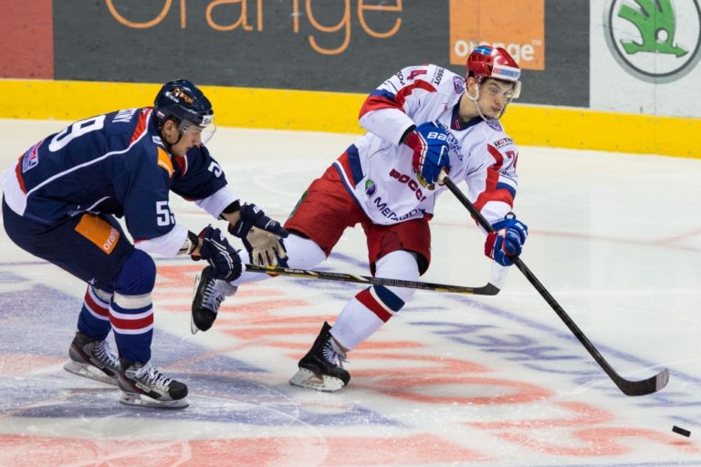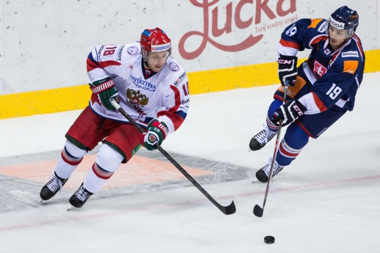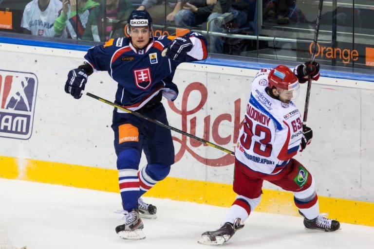 Zľava: Hráč Slovenska Andrej Štastný a hráč Ruska Evgeni Dadonov počas hokejového zápasu v rámci Euro Hockey Challenge Slovensko - Rusko. Bratislava, 13. apríl 2014. Foto: SITA/Jozef Jakubčo