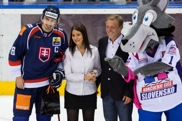 Hráč Slovenska Miroslav Šatan a generálny riaditeľ Orange Slovensko Pavol Lančarič po hokejovom zápase v rámci Euro Hockey Challenge Slovensko - Rusko. Bratislava, 13. apríl 2014. Foto: SITA/Jozef Jakubčo