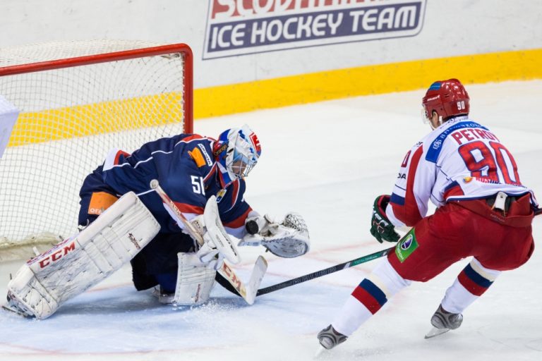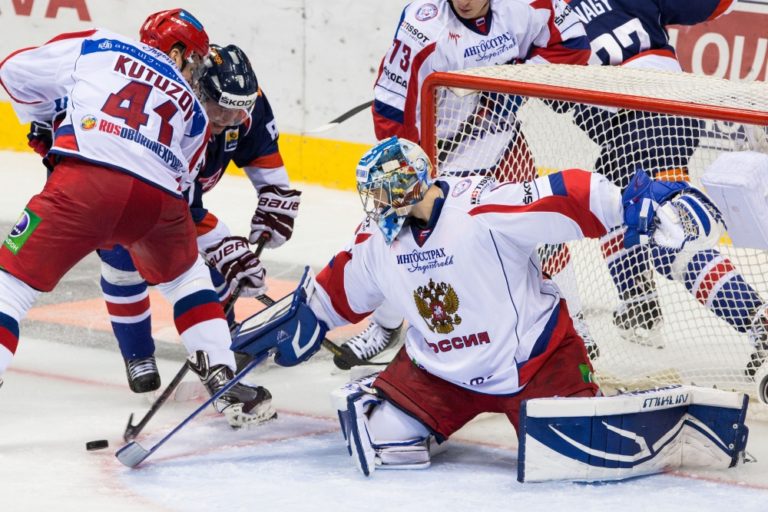 Sprava: Brankár Ruska Alexander Yeryomenko počas hokejového zápasu v rámci Euro Hockey Challenge Slovensko - Rusko. Bratislava, 13. apríl 2014. Foto: SITA/Jozef Jakubčo