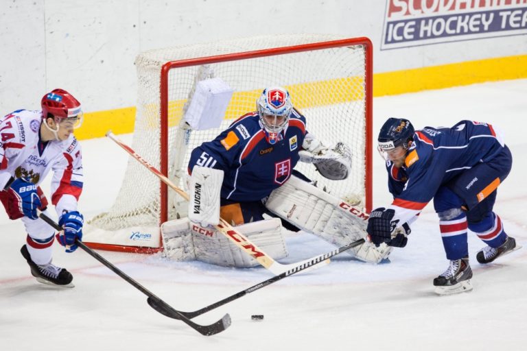 Sprava: Brankár Slovenska Ján Laco, hráč Ruska Nikolai Prokhorkin a hráč Slovenska Ivan Švárny počas hokejového zápasu v rámci Euro Hockey Challenge Slovensko - Rusko. Bratislava, 13. apríl 2014. Foto: SITA/Jozef Jakubčo