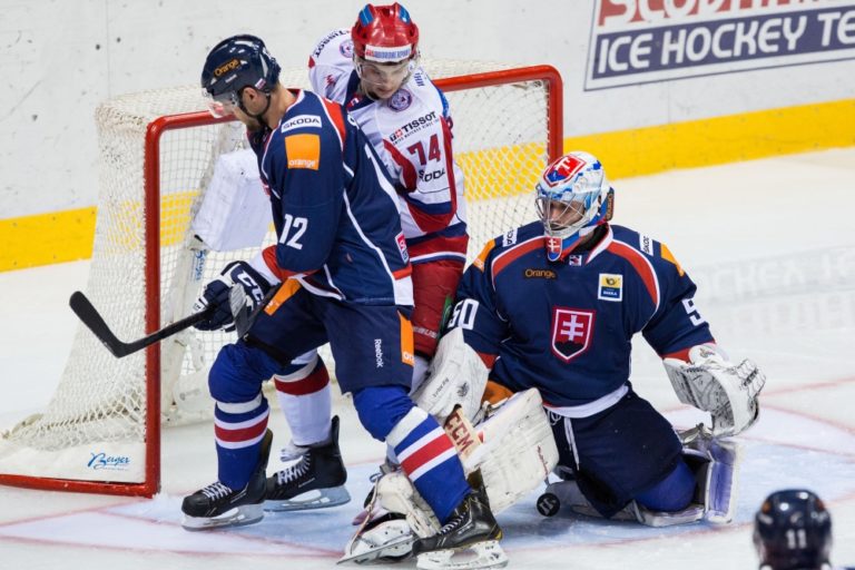Zľava: Brankár Slovenska Ján Laco a hráč Ruska Kirill Petrov počas hokejového zápasu v rámci Euro Hockey Challenge Slovensko - Rusko. Bratislava, 13. apríl 2014. Foto: SITA/Jozef Jakubčo