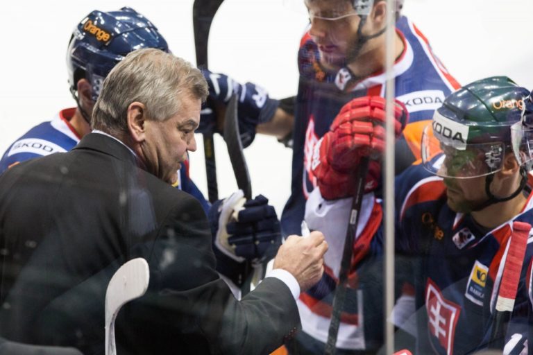 Reprezentačný tréner Slovenska Vladimír Vůjtek (vľavo) počas hokejového zápasu v rámci Euro Hockey Challenge Slovensko - Rusko. Bratislava, 13. apríl 2014. Foto: SITA/Jozef Jakubčo