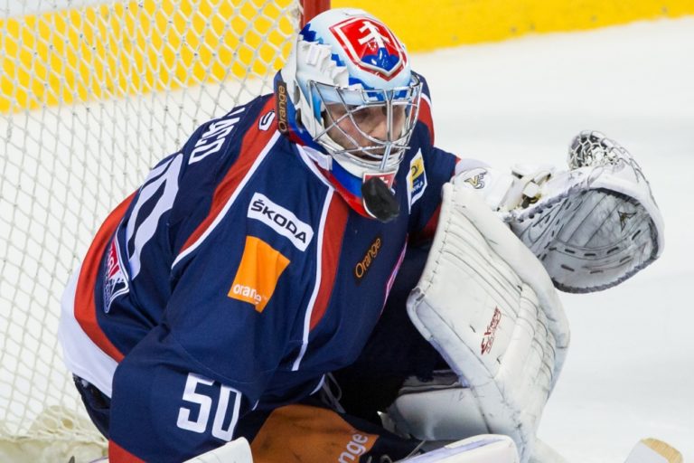 Brankár Slovenska Ján Laco počas hokejového zápasu v rámci Euro Hockey Challenge Slovensko - Rusko. Bratislava, 13. apríl 2014. Foto: SITA/Jozef Jakubčo