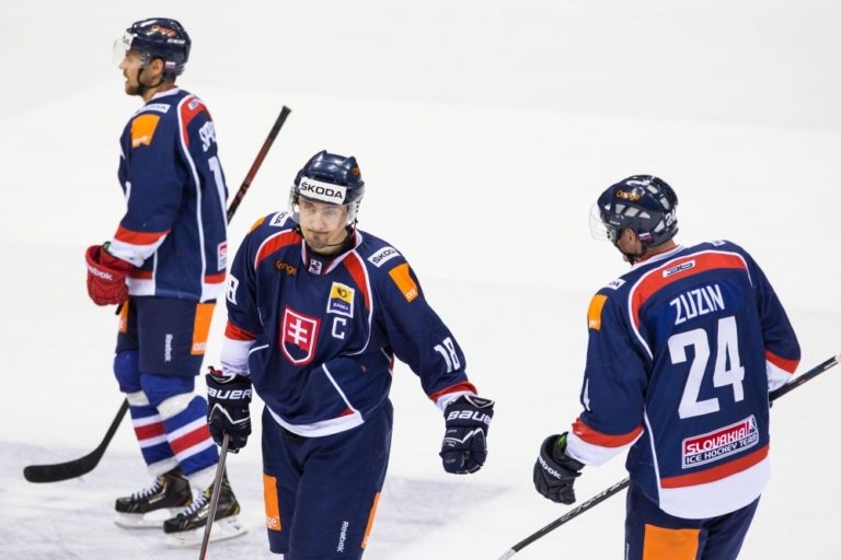 Sprava: Hráči Slovenska Peter Zuzin, Miroslav Šatan a Rastislav Špirko po hokejovom zápase v rámci Euro Hockey Challenge Slovensko - Rusko. Bratislava, 13. apríl 2014. Foto: SITA/Jozef Jakubčo