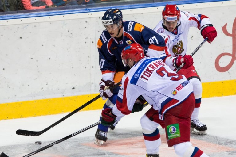 Hráč Ruska Sergei Kalinin (vpredu) a hráč Slovenska počas hokejového zápasu v rámci Euro Hockey Challenge Slovensko - Rusko. Bratislava, 13. apríl 2014. Foto: SITA/Jozef Jakubčo