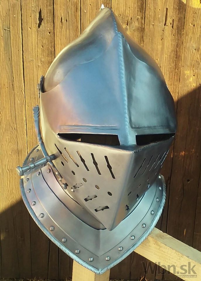 Prilba typu šalier. Je to nemecký typ z druhej polovice 15. storočia. Konštrukčne je táto helma pretiahnutá dozadu kvôli ochrane krku. Používala sa buď samostatne, alebo aj s gorgetom (nákrčník, podbradník), ktorý chránil krk z prednej strany. Foto: Archív PN