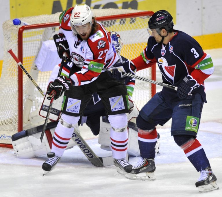 Sprava: Martin Štajnoch zo Slovana a Lukáš Kašpar z Donecku počas zápasu Kontinentálnej hokejovej ligy (KHL) medzi HC Slovan Bratislava - Donbas Doneck. Kiiskinen strieľa prvý gól zápasu. Bratislava, 28. február 2014. Foto: SITA/Ján Slovák