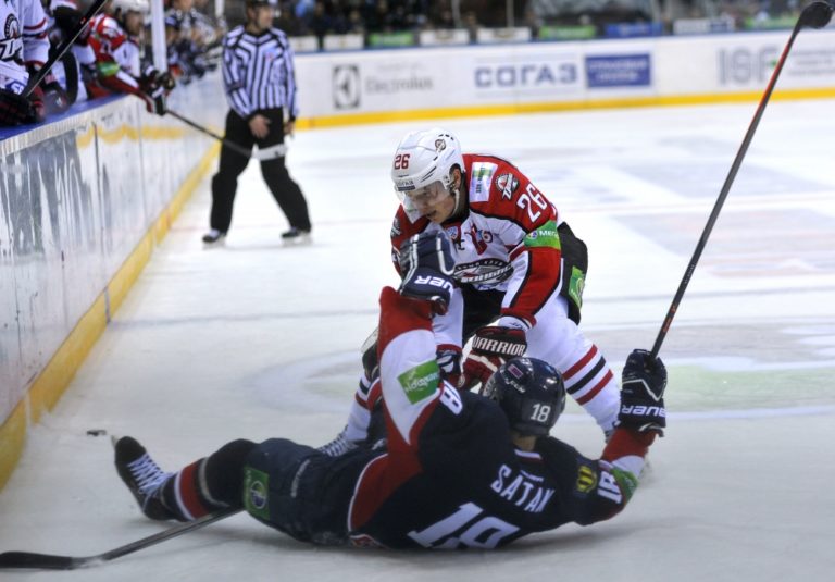 Miroslav Šatan (dolu) zo Slovana a Ruslan Fedotenko z Donecku počas zápasu Kontinentálnej hokejovej ligy (KHL) medzi HC Slovan Bratislava - Donbas Doneck. Bratislava, 28. február 2014. Foto: SITA/Ján Slovák